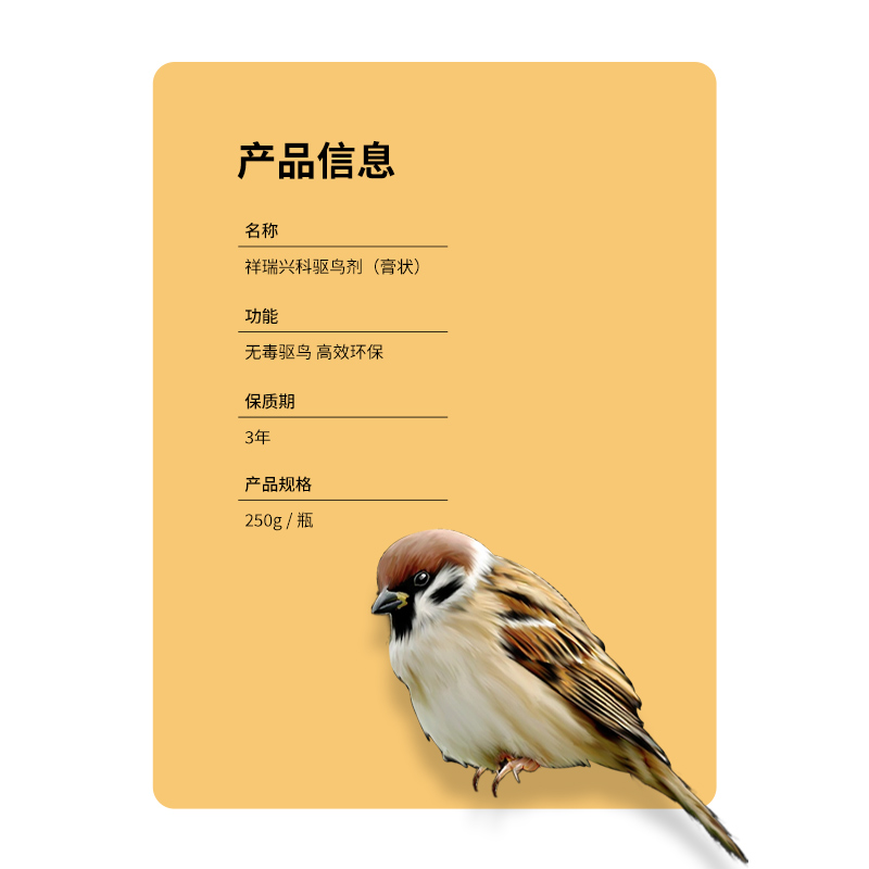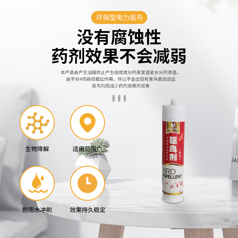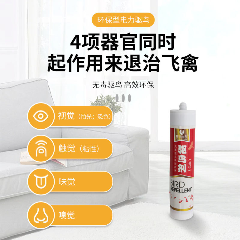 .XKNJ-2型環(huán)保型電力驅(qū)鳥劑是我公司新研發(fā)的一種驅(qū)趕鳥類產(chǎn)品,該產(chǎn)品不像原有的僅對(duì)一項(xiàng)感覺器官作用的退治方法,而是從視覺(怕光;恐色),觸覺(粘性),味覺,嗅覺等4項(xiàng)器官同時(shí)起作用來退治飛禽,效果非常顯著。產(chǎn)品主要天然香料,對(duì)人畜無害,此外為了刺激嗅覺還添加了天然植物性精油,此產(chǎn)品是環(huán)保的天然驅(qū)鳥劑。本產(chǎn)品對(duì)設(shè)備沒有任何腐蝕性,并且本產(chǎn)品會(huì)產(chǎn)生油膜防止產(chǎn)生組成成分的蒸發(fā)或者水分的滲透,由于對(duì)4項(xiàng)器官都起作用,所以不會(huì)出現(xiàn)有害鳥類因適應(yīng)驅(qū)鳥劑而減少藥劑效果的現(xiàn)象。該產(chǎn)品的持效期為1年左右,可適應(yīng)任何氣候,在-20°C以下,37°C以上的溫度都不會(huì)影響其效果,該產(chǎn)品廣泛用于飛機(jī)場(chǎng),電氣化鐵路,油田,電力設(shè)施,太陽能發(fā)電,太陽能路燈,食品廠,養(yǎng)殖場(chǎng),食品飼料倉庫,果園,農(nóng)田等行業(yè)。安裝于草坪、樹枝、鐵塔、電線桿、水箱表面、木頭、灌木、牌匾、鐵道邊、倉庫、停車設(shè)備、普通建筑物、大眾化建筑物和公共建筑物等鳥害場(chǎng)所。